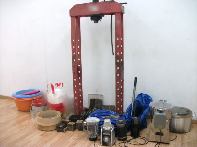 - Πλήρης εξοπλισμός εργαστηρίου τυποποίησης και επανασυσκευασίας ναρκωτικών ουσιών (υδραυλική πρέσα , μεταλλικά καλούπια κλπ).